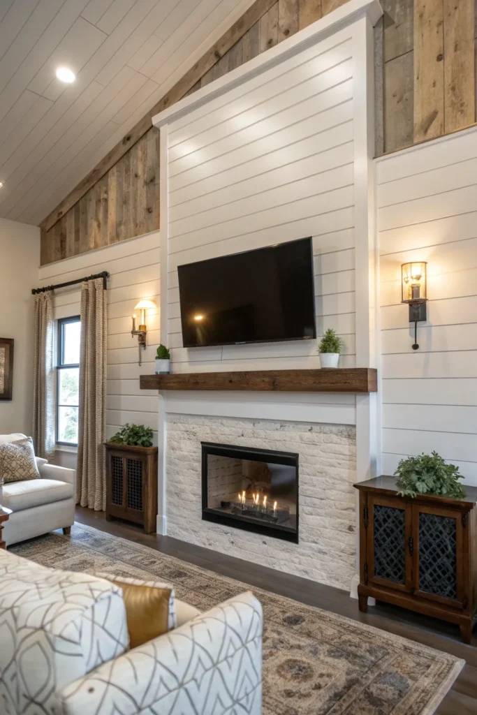 Install vertical or horizontal shiplap around the fireplace and TV for a charming farmhouse feel. Crisp white shiplap brightens the room and blends the TV into the wall.