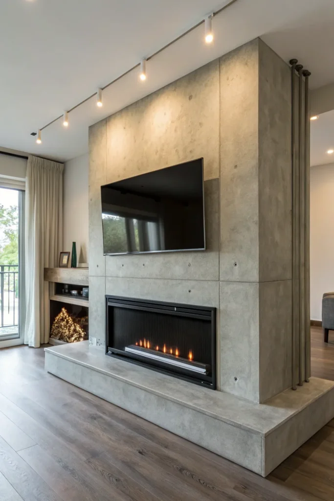 A smooth concrete fireplace gives your room a cool, industrial-modern edge. Mount the TV above for a minimalist aesthetic with strong design lines.