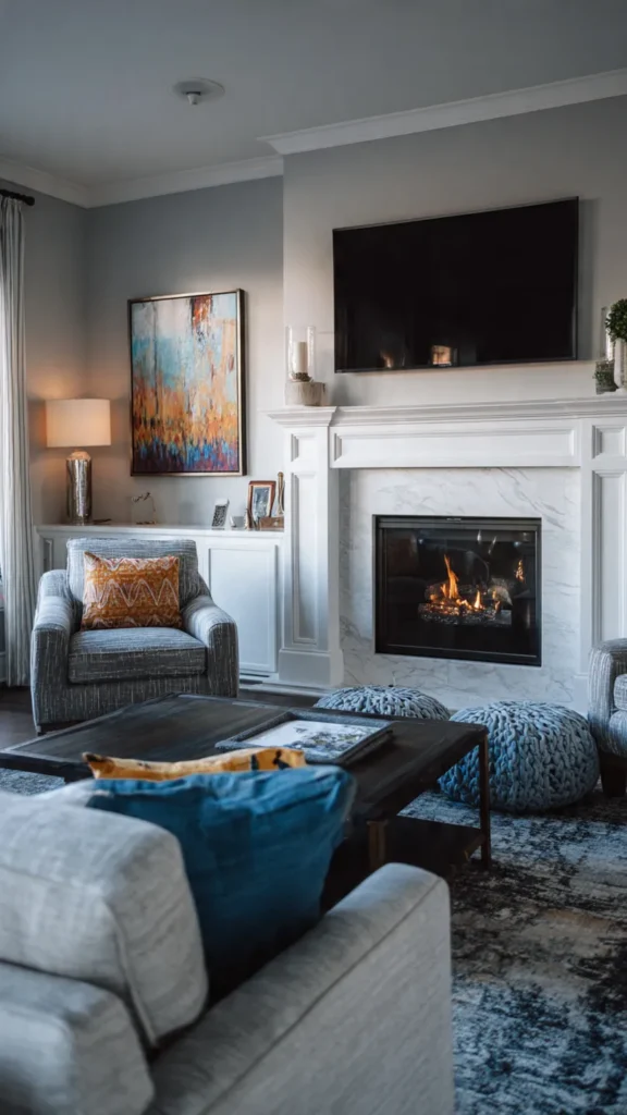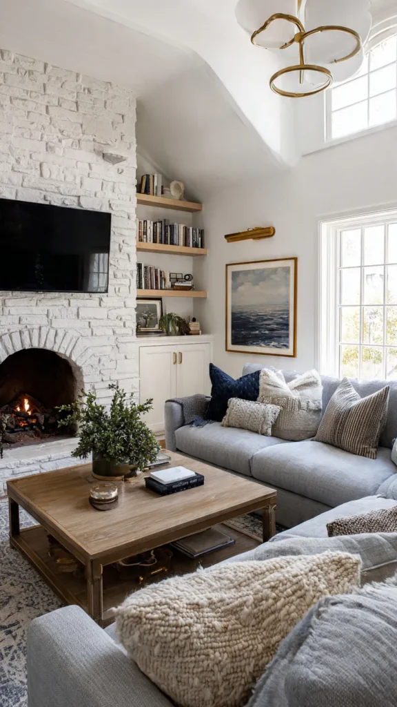 Modern designs often place the TV above or beside the fireplace, framed carefully so neither element overwhelms the other. This combination feels intentional and timeless.