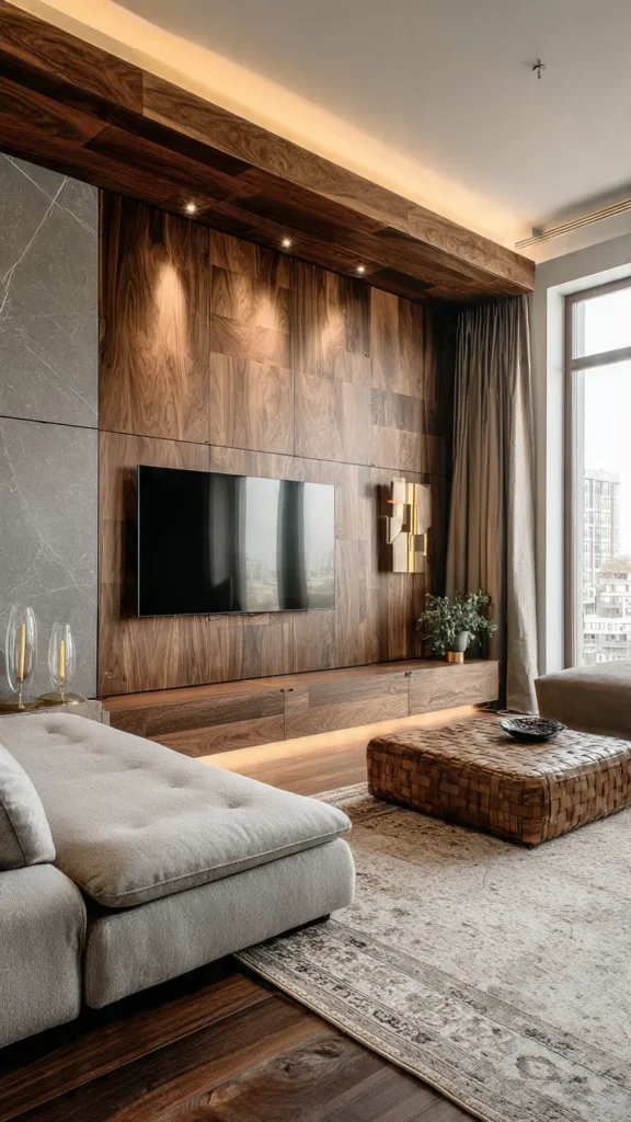 A media wall is a popular modern solution for TV-centered living rooms. The television is mounted on a feature wall designed with wood panels, textured finishes, or subtle lighting.