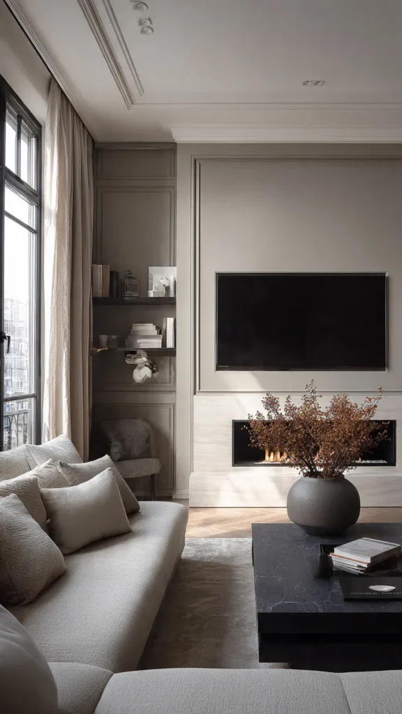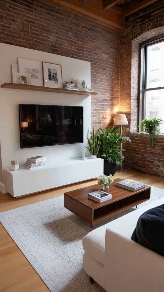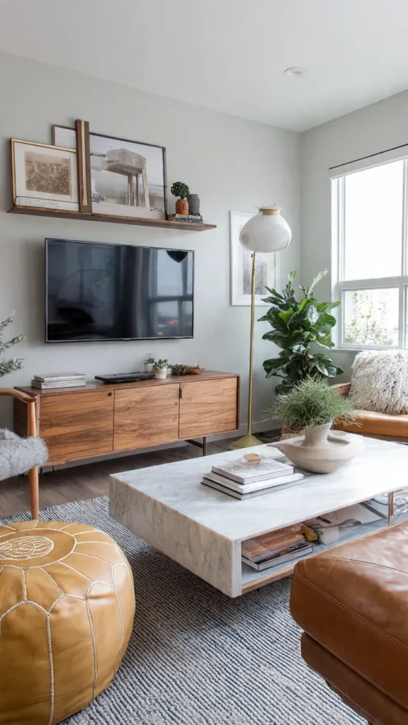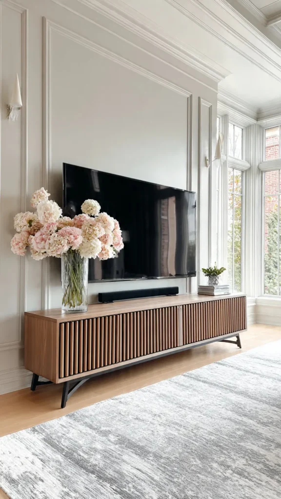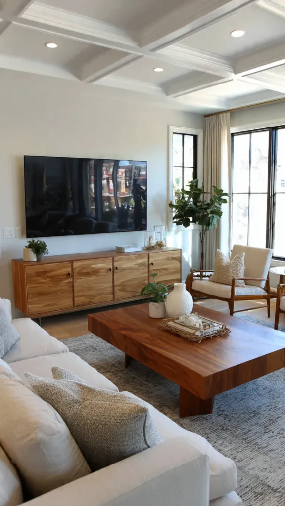 In modern living rooms, mixing functional and decorative elements creates harmony. The TV becomes one component of a larger visual composition rather than the sole point of attention.