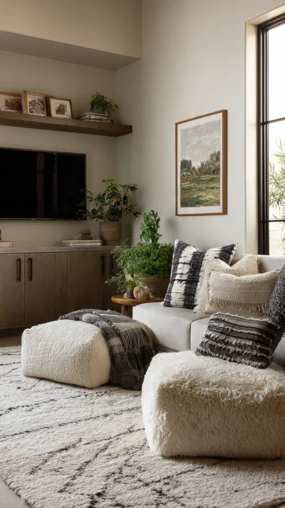 Comfort matters in a TV-centered living room. Create a cozy viewing zone with plush seating, soft cushions, and layered textiles. Rugs help define the area and add warmth.