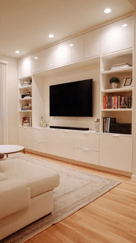 Shelves can hold books, art, plants, and decorative objects, helping the TV blend seamlessly into the overall design. This creates a custom, high-end look that feels modern and organized.