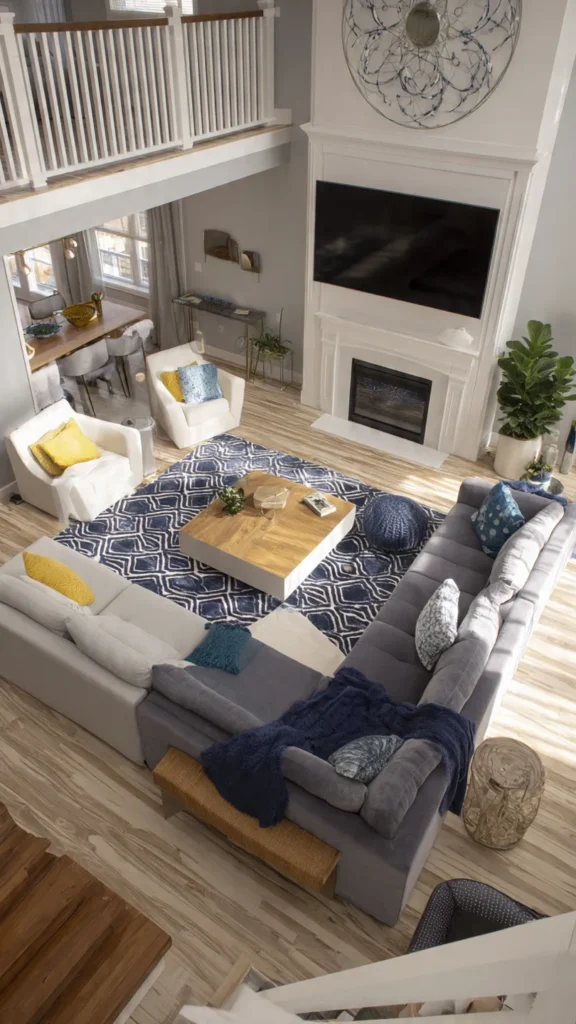 This flexible arrangement supports movie nights as well as social gatherings, making the living room multifunctional and inclusive.
