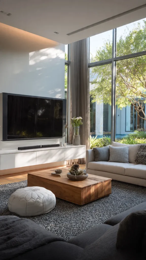 Technology can feel cold if not balanced properly. Adding texture through rugs, cushions, curtains, and natural materials helps soften the presence of the TV.