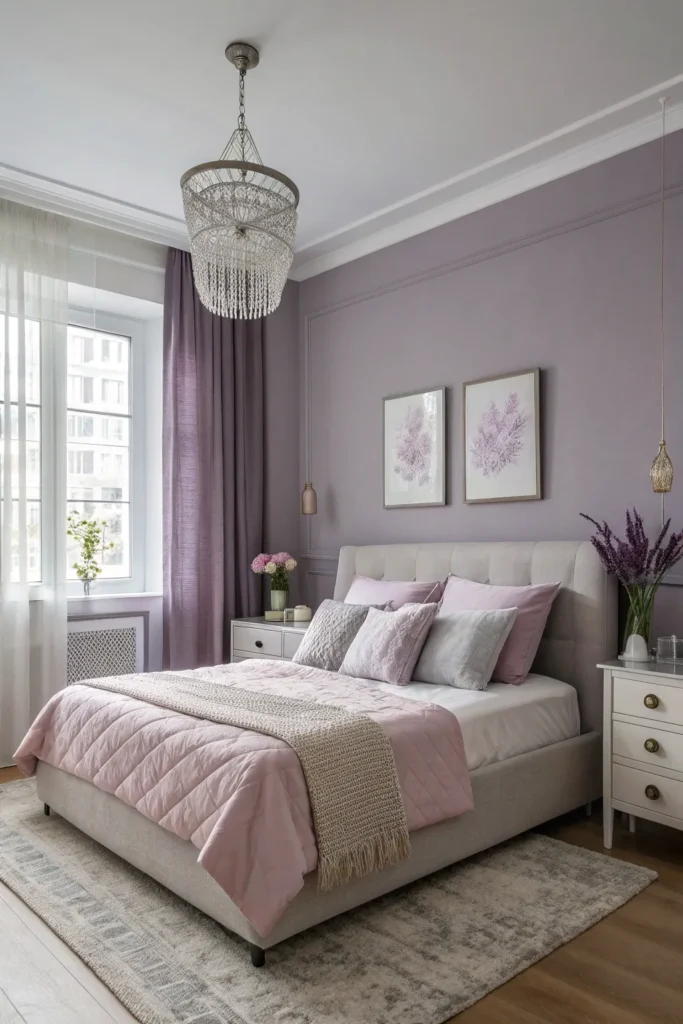 Lavender can feel surprisingly elegant when paired with soft gray. Instead of bright purple tones, choose a muted lavender with gray undertones. This pairing creates a serene, slightly romantic bedroom without feeling childish.