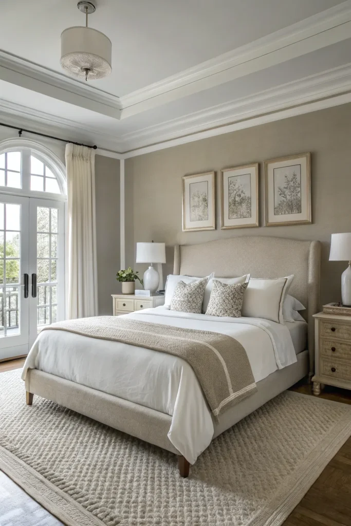 Greige works well as the main wall color, with white trim, ceilings, and bedding providing contrast. This palette is perfect if you want a neutral bedroom that still feels layered and intentional.