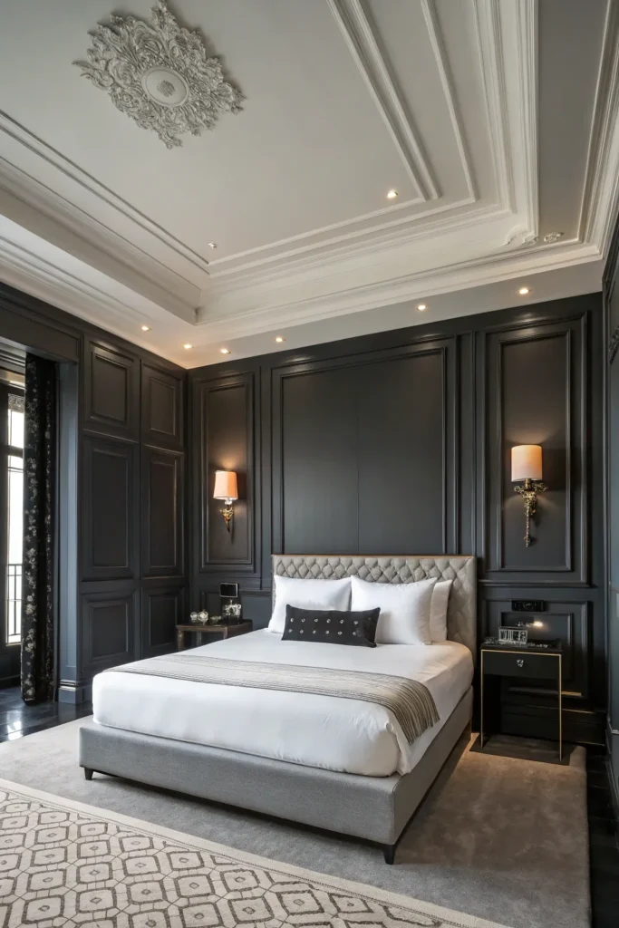 Use charcoal on the wall behind the bed or on the lower portion of the walls, and keep the rest white to avoid making the room feel heavy. Metallic accents, such as brushed brass lamps or black-framed artwork, enhance the designer feel of this palette.