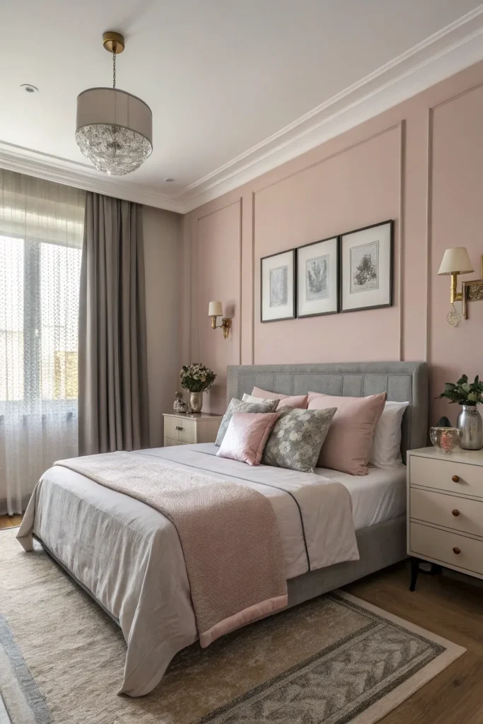 Paint one wall or the lower half of the room in blush and keep the rest gray for balance. Upholstered headboards, soft throws, and minimal decor help maintain a refined, designer-inspired feel.