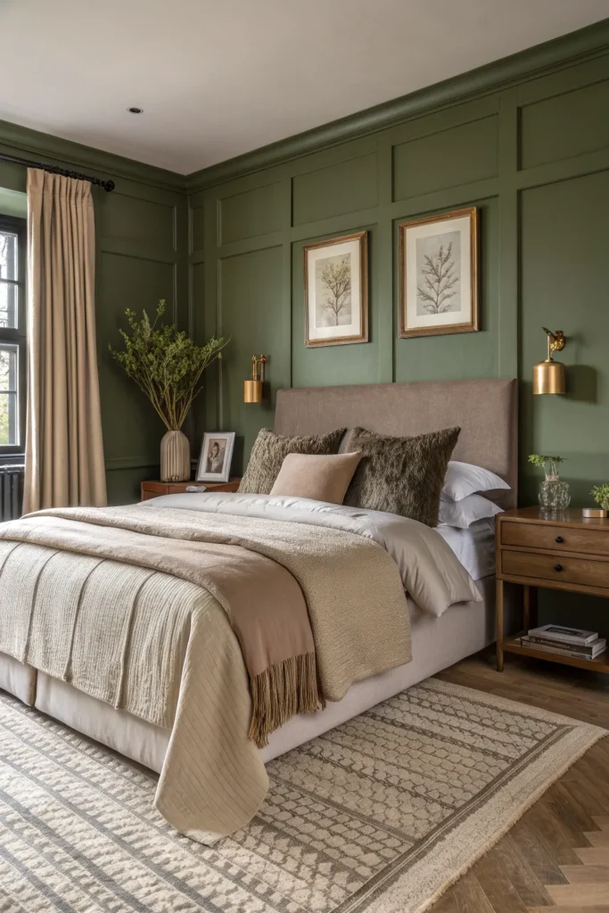 Olive green and taupe create a grounded, earthy bedroom palette that feels sophisticated and welcoming. Olive adds depth and richness, while taupe provides a neutral base that softens the overall look.
