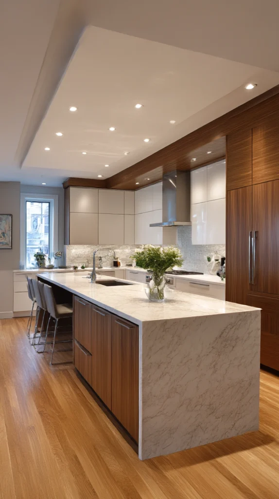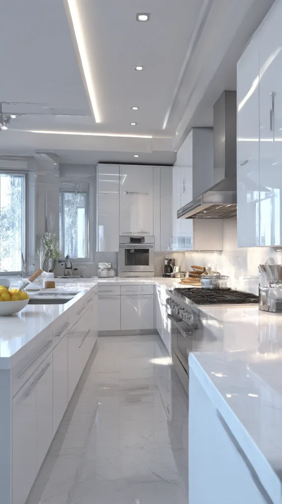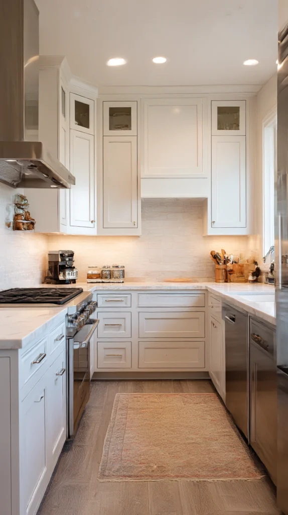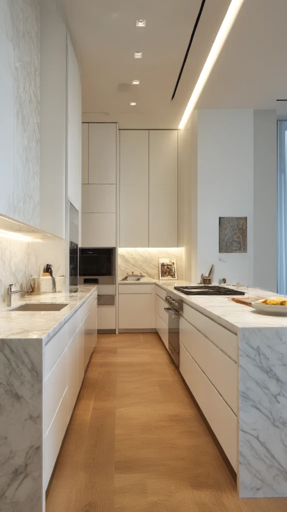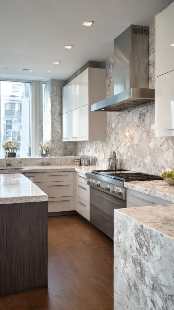 Quartz engineered stone in a warm, complex white or a deep, dramatically veined pattern provides the U-shaped kitchen with a work surface of extraordinary durability, extraordinary stain resistance, and genuine visual sophistication.