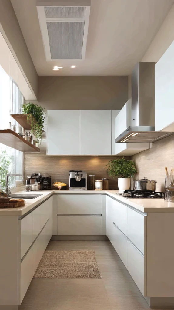 An island or peninsula installed at this open end, positioned at a considered distance from the U’s working arms to maintain adequate circulation space on all sides, adds a fourth work surface of considerable practical value while simultaneously creating the visual anchor and the social heart of the kitchen that transforms it from a purely functional cooking environment into a genuinely sociable domestic space where guests gather, children complete homework, and the household’s daily life organises itself around the kitchen’s warm, active centre.