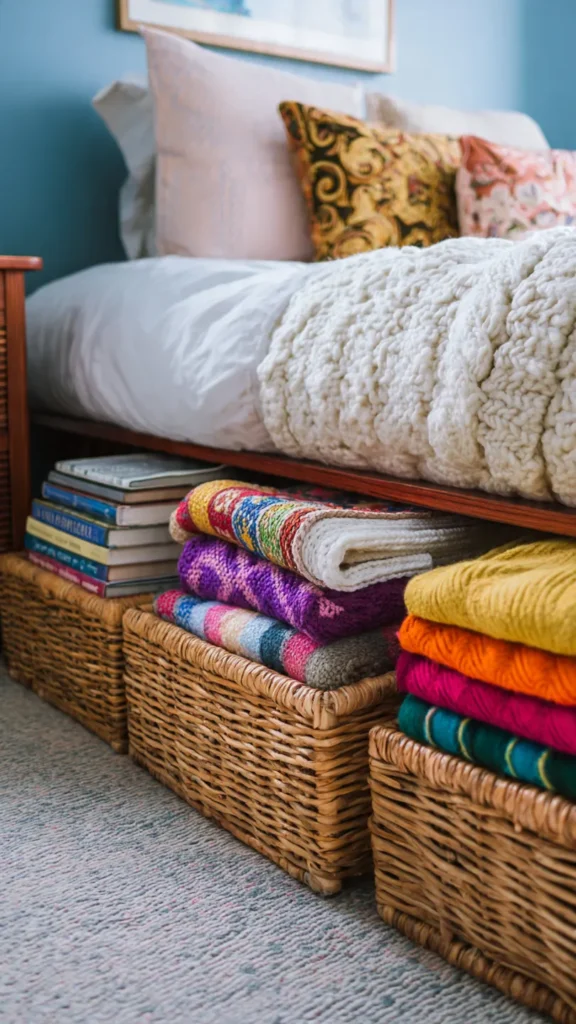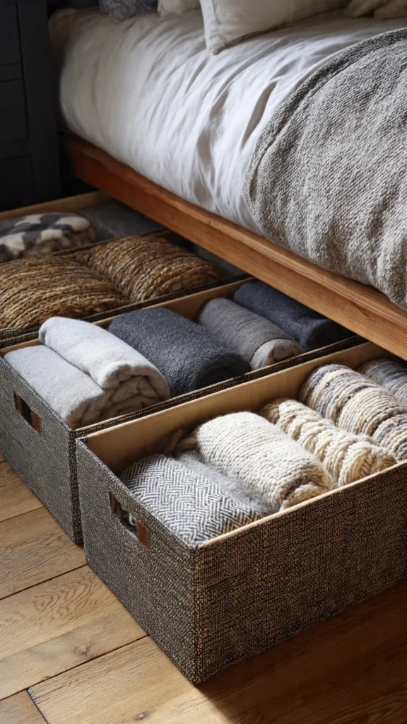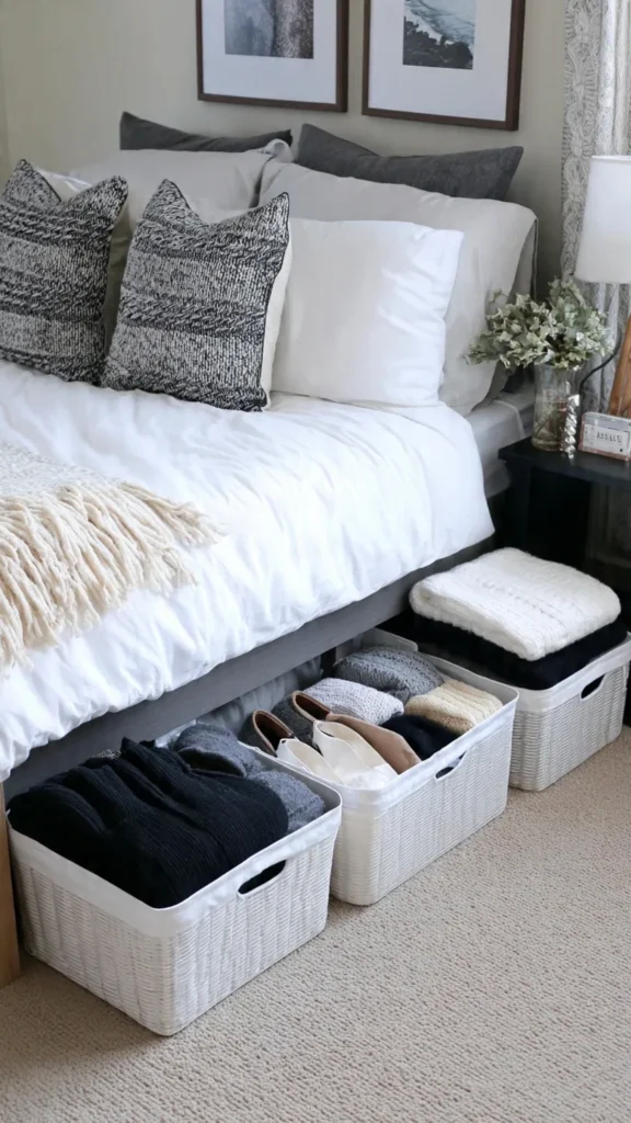 Choose baskets with a structured shape so they slide easily under the bed without collapsing. Handles are helpful for pulling them out smoothly. This option works well for storing extra blankets, pillows, or seasonal clothing while contributing to the room’s overall aesthetic.