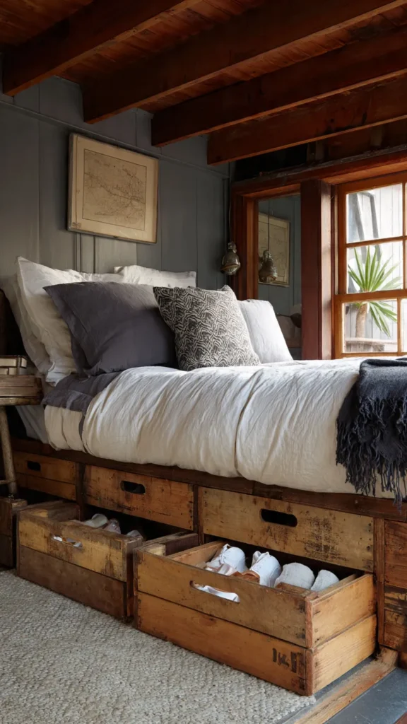 Wooden crates offer a structured, timeless option for under-bed storage. When chosen carefully, they can look like part of the bed’s design rather than separate storage pieces. Their solid form adds visual weight, making the storage feel grounded and intentional.