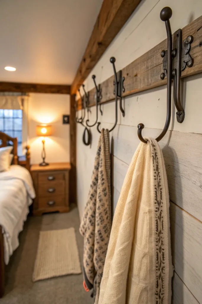 Rustic hooks made from wrought iron or distressed wood bring a cozy, lived-in feel to homes with farmhouse or cottage aesthetics.