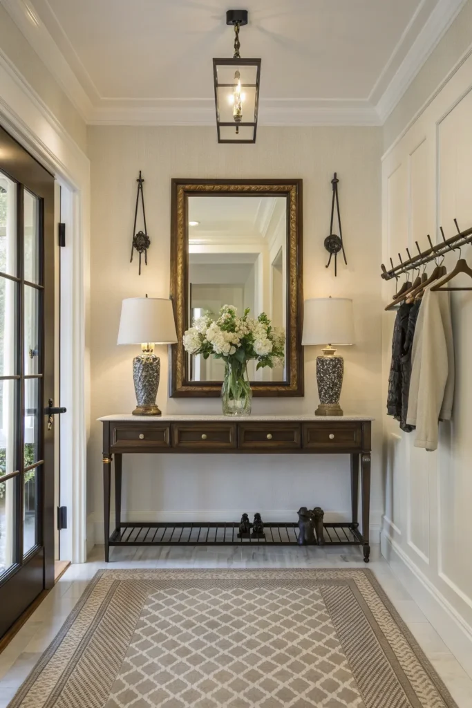 Layering hooks with framed art, mirrors, or wall sconces creates a curated, designer-like effect. This idea turns a functional wall into a visual story.