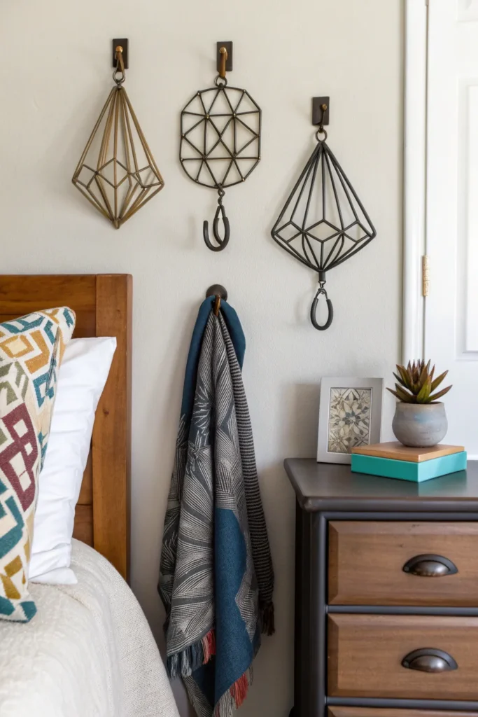 In entryways, use sculptural hooks as a focal point on an otherwise simple wall. In bedrooms, place them above a bench or nightstand to add visual interest. Limiting the number of items hung keeps the design visible.