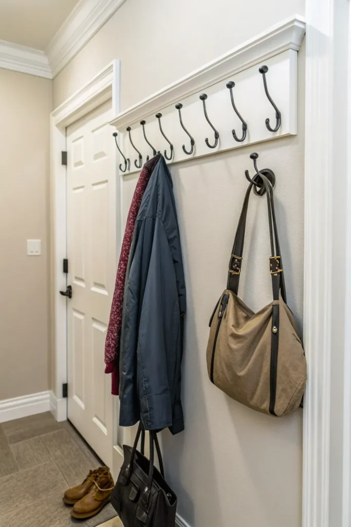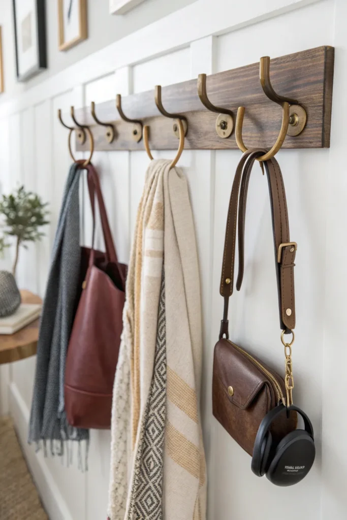 This solution is ideal for families and renters, as rails can often be moved or replaced easily. The downside is that overcrowding the rail can look messy. A pro tip is to limit each hook to one item and rotate seasonally.