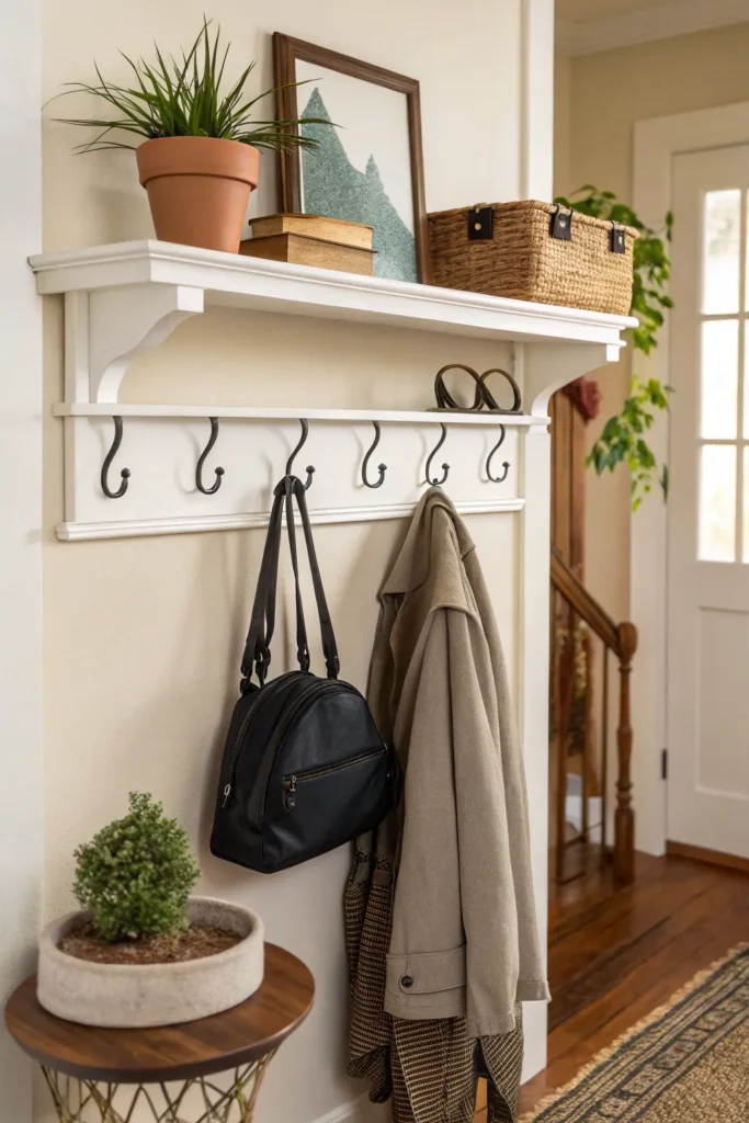 Combining hooks with a shelf adds extra functionality, allowing space for keys, mail, or decorative objects. This setup is ideal for entryways that need both hanging and surface storage.