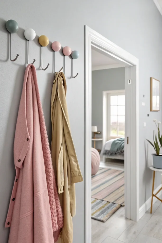 In entryways, color-matched hooks blend into the wall, letting coats stand out instead. In bedrooms, soft pastel hooks can add subtle charm without overpowering the space. This approach keeps the room visually calm.