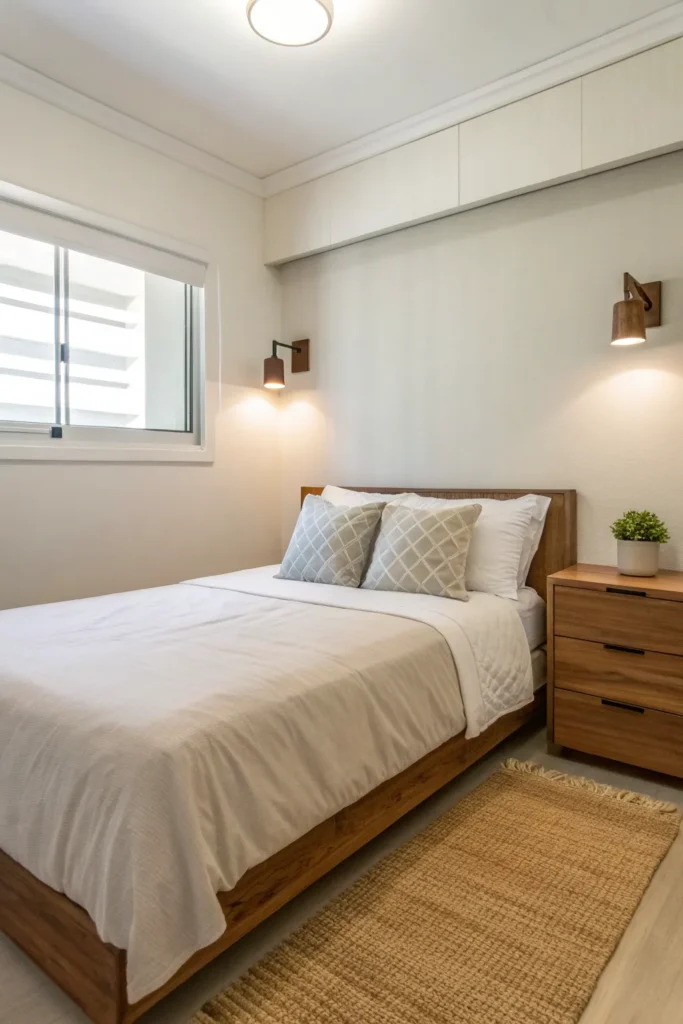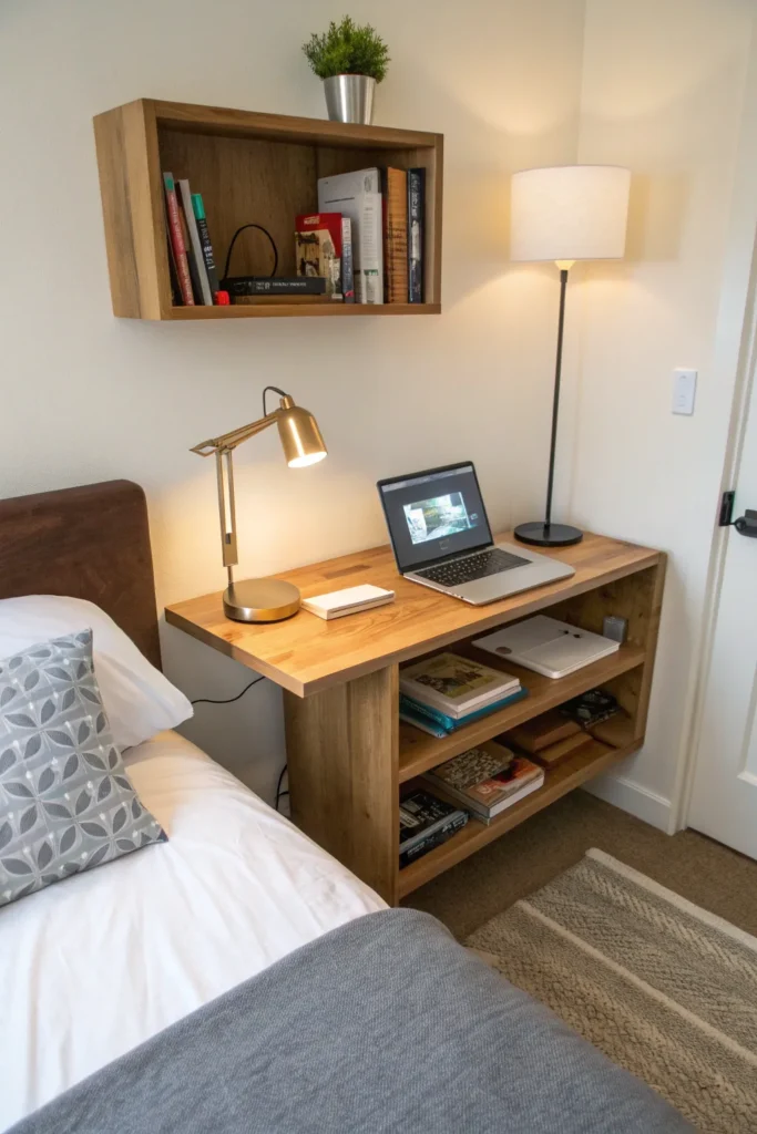 In ultra-small bedrooms, furniture often needs to serve more than one purpose. A wall-mounted shelf that functions as both a nightstand and a small desk can be a game changer.