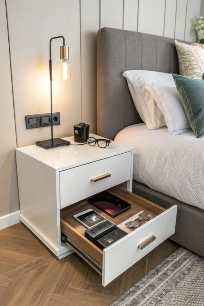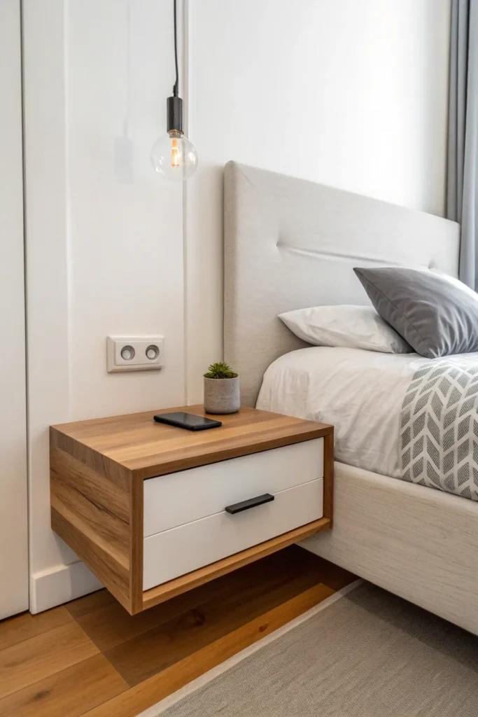 A floating shelf with a slim hidden drawer is one of the most practical choices for a tiny bedroom. The shelf surface provides space for a lamp, book, or phone, while the concealed drawer keeps clutter out of sight. This combination maintains a clean look without sacrificing storage.