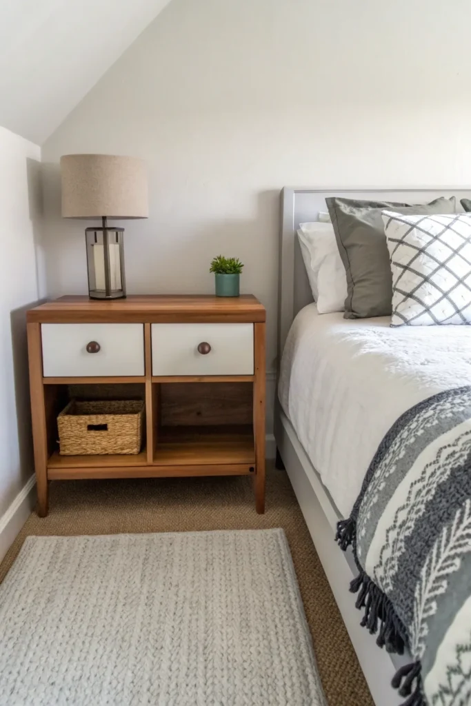Painting or choosing a nightstand in the same color as the wall helps it visually disappear. This trick is especially effective in tiny bedrooms where visual simplicity matters.