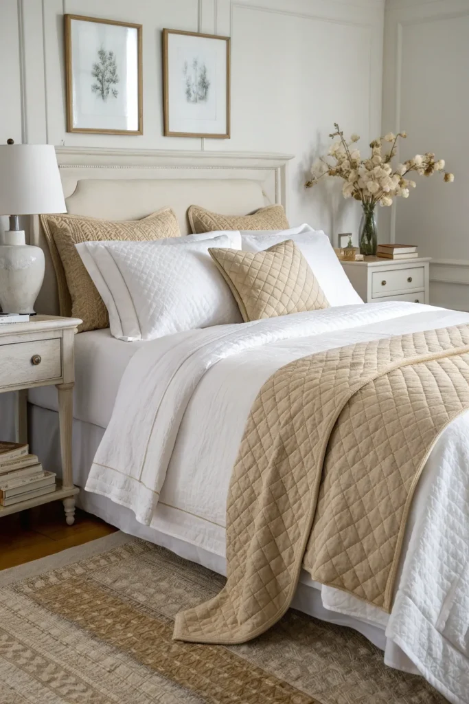Start with crisp white sheets as a base, then add beige duvets, quilts, or coverlets. Finish with throw pillows in slightly darker or warmer tones to create gentle contrast and a cozy, inviting feel.