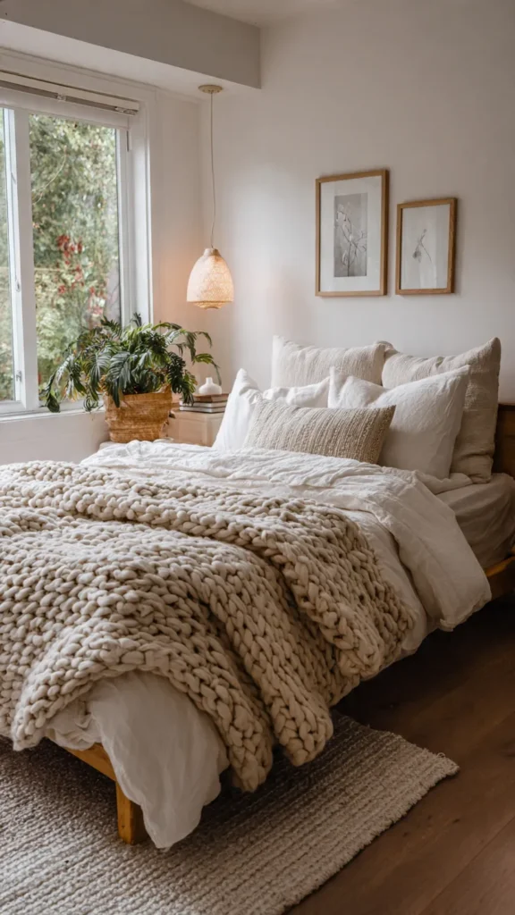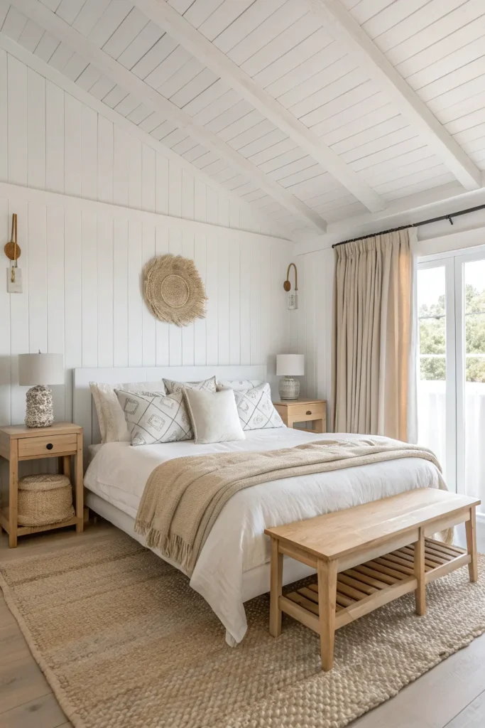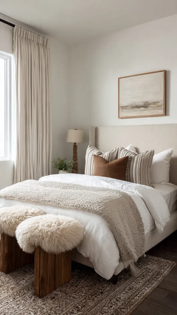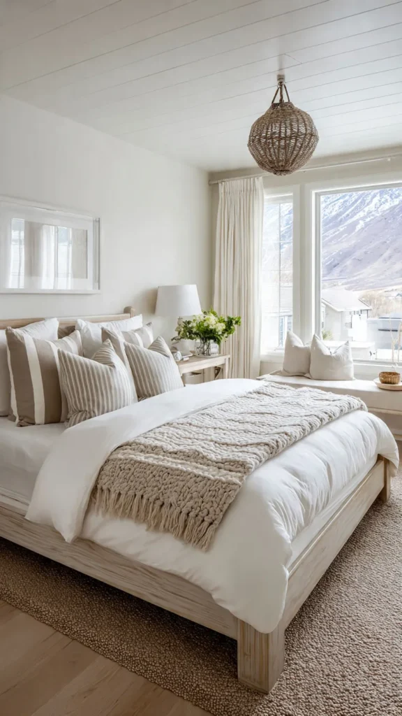 Patterns in white and beige add personality while keeping the bedroom calm. Think delicate stripes, soft geometrics, or understated florals.