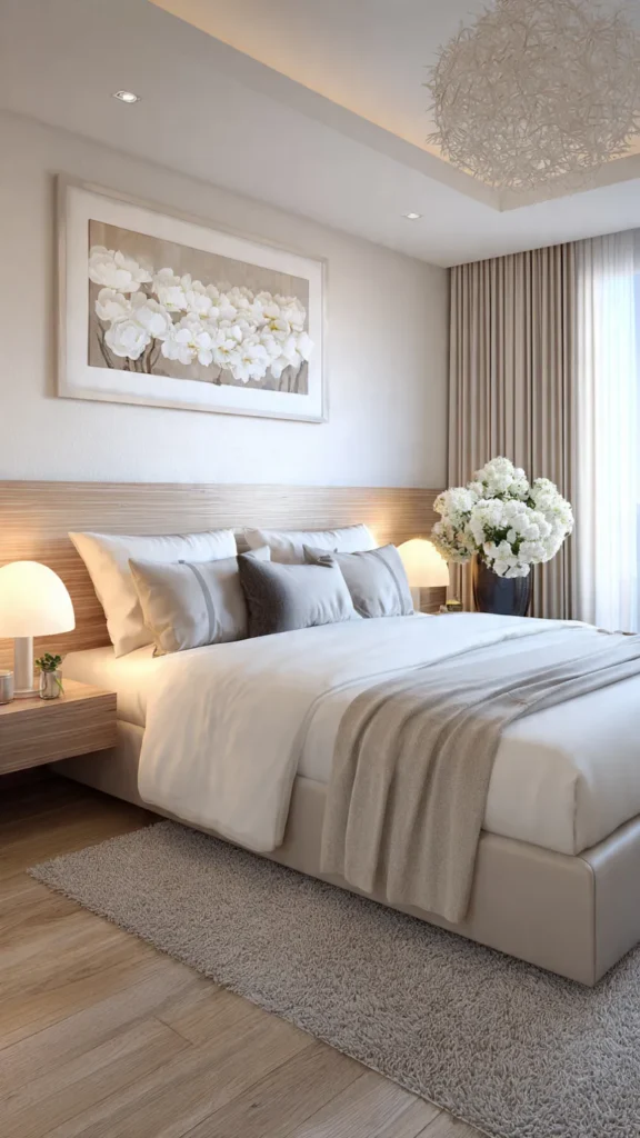Scandinavian style is a natural fit for white and beige color schemes. It focuses on simplicity, light, and natural materials, all of which enhance a calm bedroom environment.