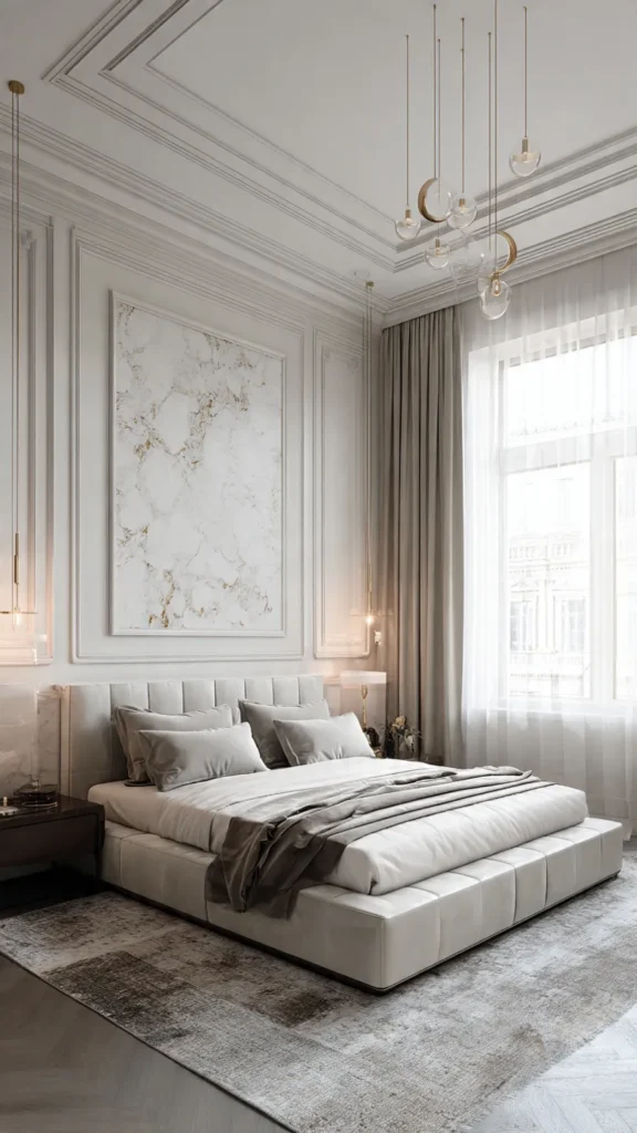 Styling tip: Add light wood nightstands or a bench at the foot of the bed to introduce warmth without straying from the neutral palette.