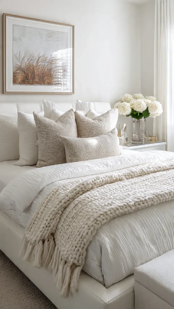 Layering is essential when working with a soft neutral palette like white and beige. Using multiple shades of ivory, cream, sand, and warm beige in your bedding prevents the room from feeling flat or monotonous.