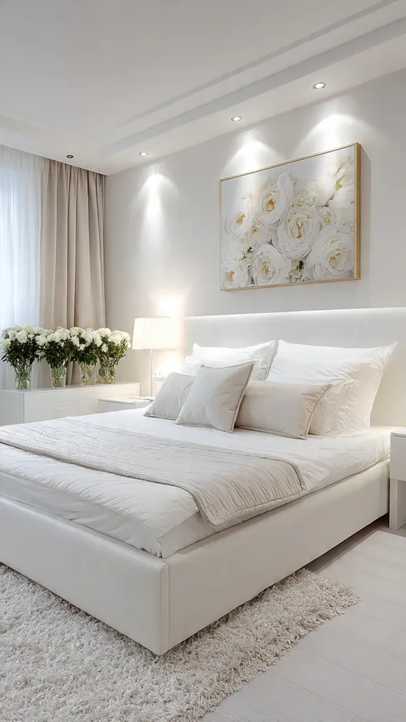 An all-white bedroom foundation provides maximum brightness and flexibility. Introducing beige through accessories allows you to warm up the space without changing major elements.