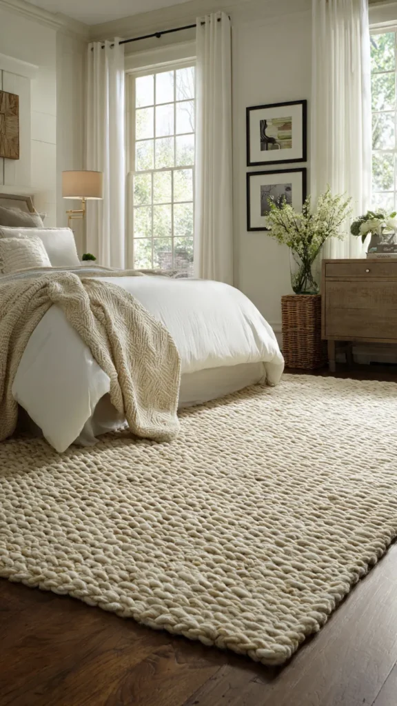 Textured rugs, such as woven or looped styles, bring subtle interest without introducing bold patterns. This keeps the room calm yet inviting.