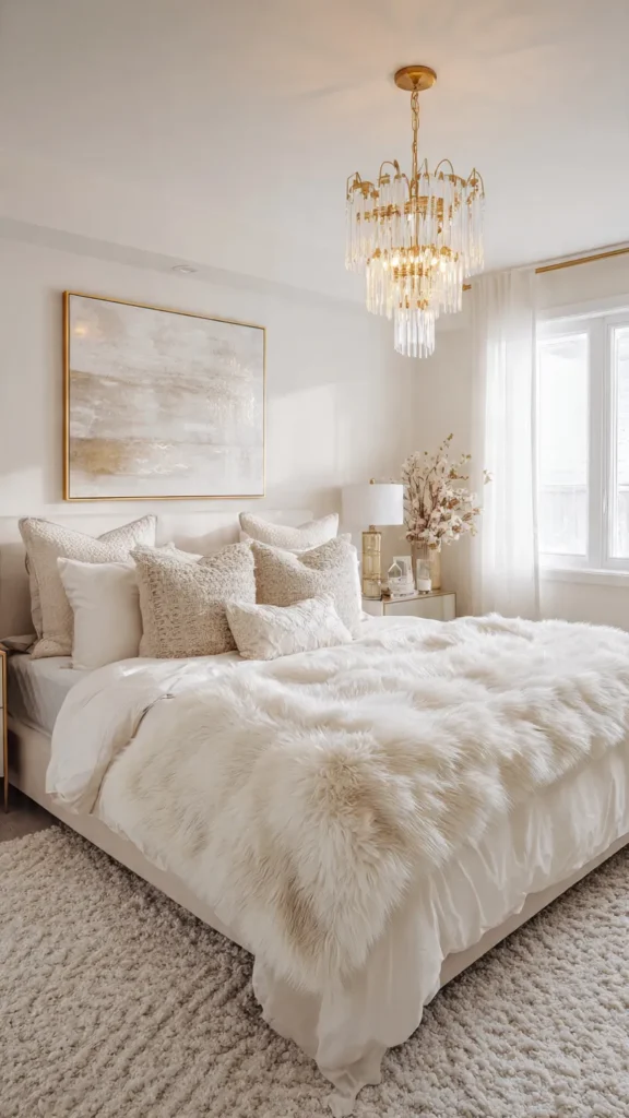 A glam white and gold bedroom doesn’t have to feel cold or overly formal. Balance the shine of gold accents with soft textures like velvet pillows, faux fur throws, or plush area rugs. White keeps the room light and airy, while gold adds drama and sophistication. The key is layering textures so the space feels inviting and comfortable, not just visually stunning.