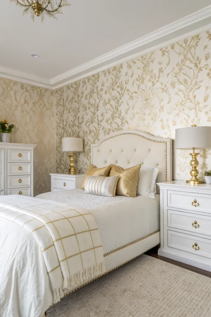 Gold wallpaper can add depth and interest to a bedroom when used thoughtfully. Opt for subtle patterns or metallic finishes that catch the light without overwhelming the space. Pair gold wallpaper with white furniture to keep the room balanced and bright. This approach works particularly well for accent walls behind the bed, creating a luxurious backdrop while maintaining a serene overall feel.