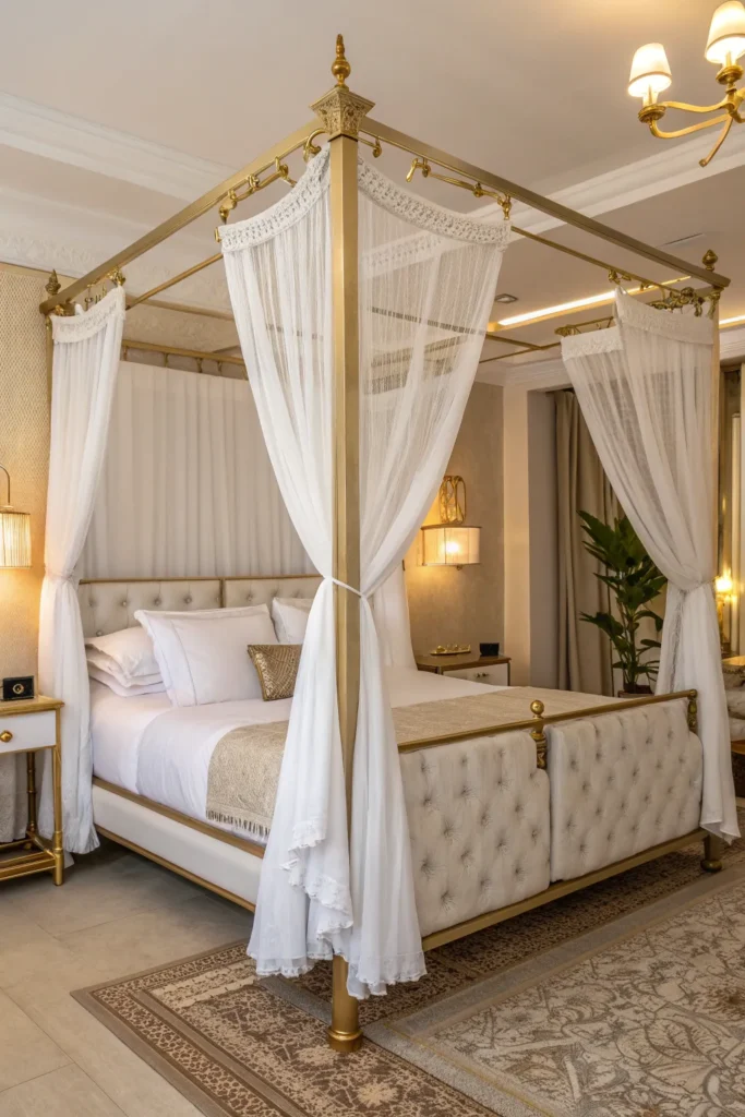 A white canopy bed brings a sense of romance and elegance to the bedroom. When accented with gold hardware or frame details, it becomes a striking focal point. Sheer white curtains enhance the airy feel, while gold elements add structure and sophistication. This idea is perfect for creating a retreat-like atmosphere that feels both cozy and refined.