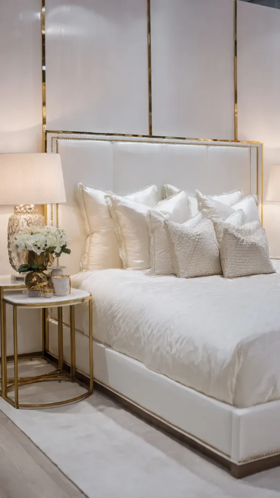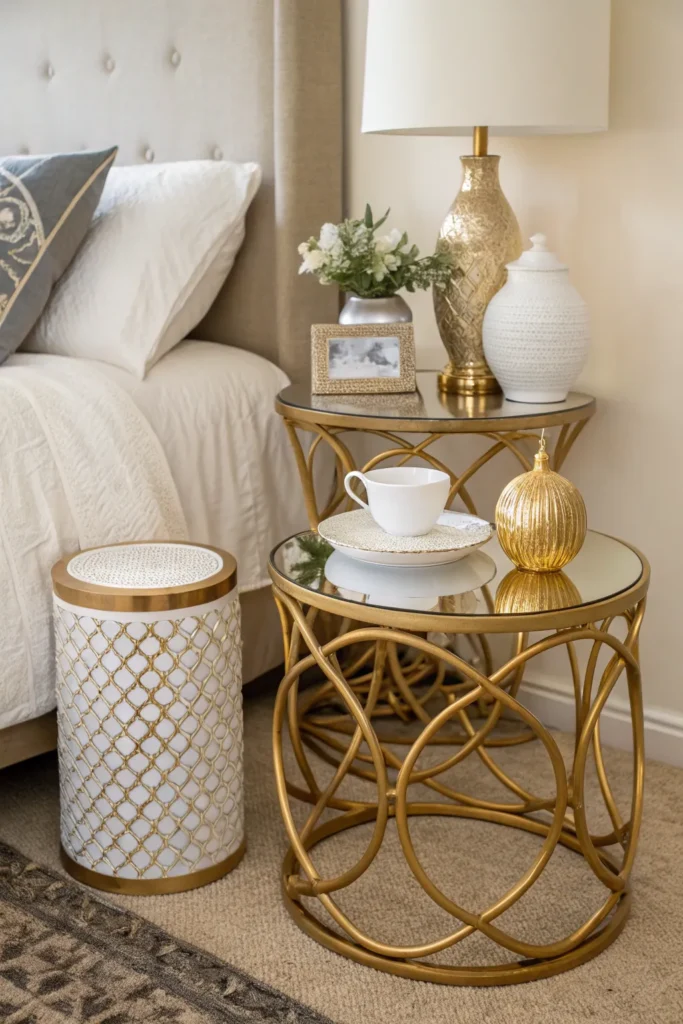 Gold side tables are an easy way to introduce metallic accents without committing to large furniture pieces. Pair them with white décor items such as ceramic lamps, vases, or books to keep the look cohesive. The contrast between gold tables and white accessories adds visual interest while maintaining a calm and balanced aesthetic. This idea is especially effective in smaller bedrooms where subtle accents make a big impact.