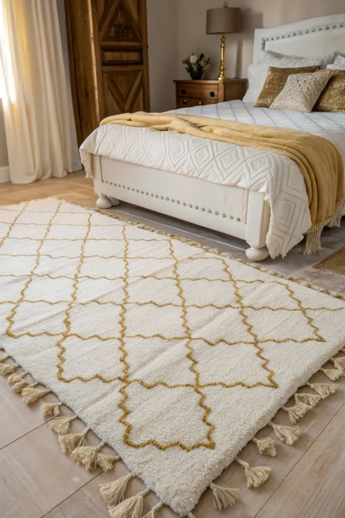 A white rug anchors the bedroom and adds softness underfoot. Choose rugs with subtle gold patterns or threads for an extra layer of elegance. These designs add interest without dominating the room, making them ideal for maintaining a serene atmosphere. White rugs with gold accents tie together the color scheme while enhancing the cozy feel of the space.
