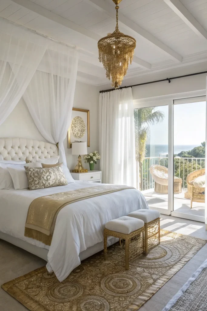 A white and gold bedroom strikes the perfect balance between elegance and comfort. White creates a calming, airy foundation, while gold adds warmth, glamour, and a touch of luxury that instantly elevates the space.