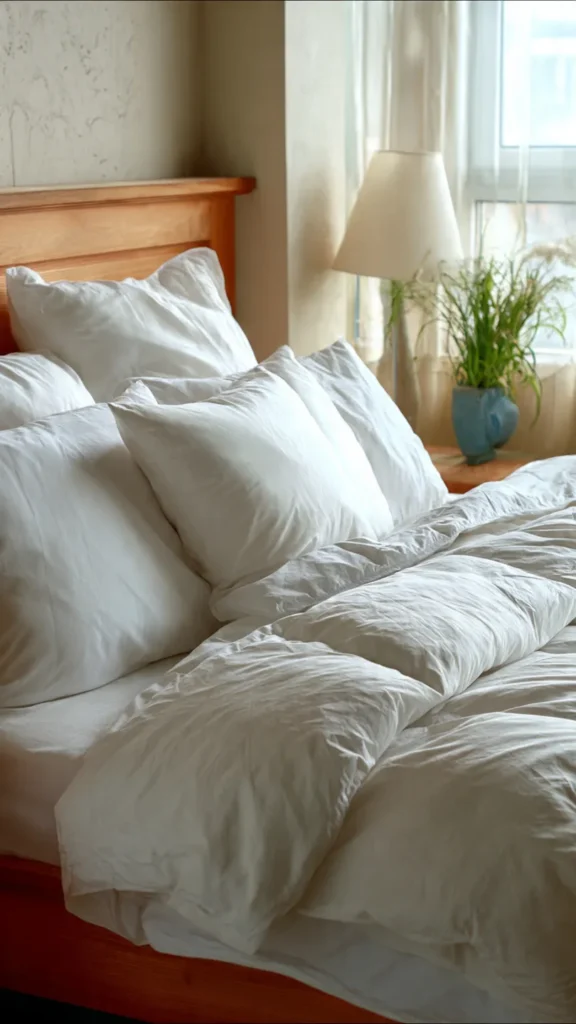 Layering white bedding is one of the simplest ways to create a hotel-inspired retreat. Crisp sheets, fluffy duvets, and soft quilts build depth through texture rather than color. Introduce gold through accent pillows, embroidered details, or subtle metallic thread in the bedding. These small touches catch the light and add warmth without overpowering the serene white base. The result is a bed that feels luxurious yet inviting, perfect for unwinding at the end of the day.