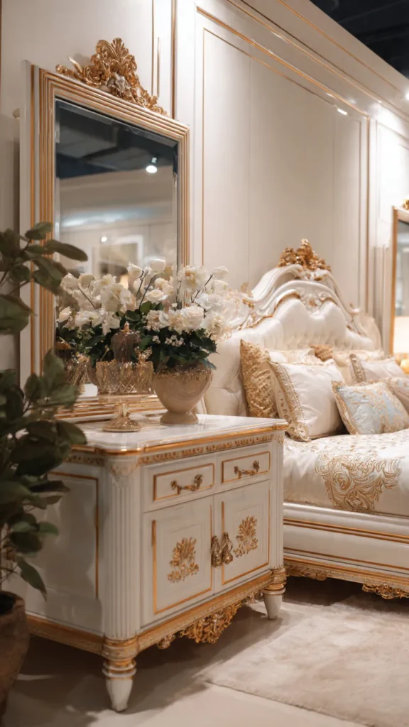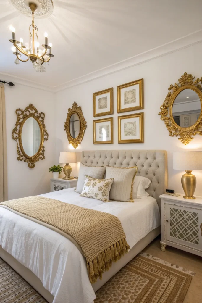 Mirrors are a powerful design tool in bedrooms, especially when framed in gold. A gold-framed mirror above a dresser or leaning against a wall reflects light, making the space feel brighter and larger. The metallic frame acts as décor while still serving a practical purpose. Paired with white walls and furnishings, gold mirrors create a refined focal point that enhances the overall chic aesthetic.