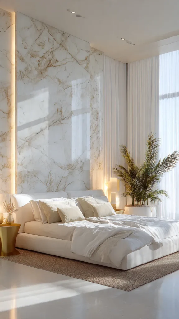 Starting with soft white walls sets a clean and peaceful backdrop that reflects light beautifully. Instead of stark white, choose warm whites or ivory tones to avoid a cold feel. Gold accent lighting, such as wall sconces, pendant lights, or bedside lamps, introduces a subtle glow that feels inviting rather than flashy. The contrast between matte white walls and metallic gold finishes creates visual interest without overwhelming the room. This combination works especially well in bedrooms that rely on ambient lighting for a relaxed atmosphere.