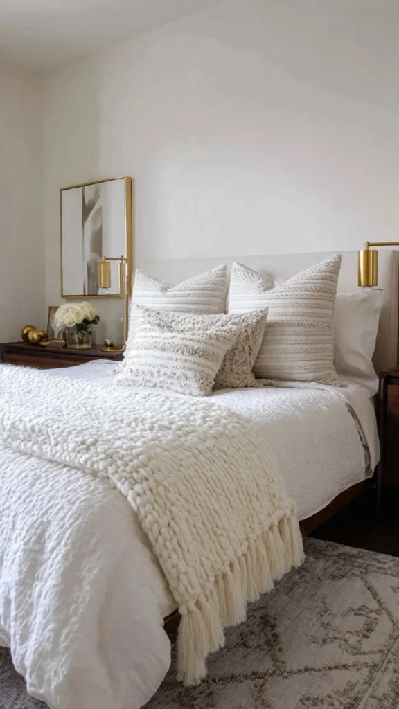 White textiles such as curtains, rugs, and throws soften the bedroom and add layers of comfort. Pair these with brushed gold hardware on furniture, doors, or light fixtures for a cohesive look. Brushed gold, rather than high-shine finishes, offers a warmer and more understated feel that complements cozy textures. This combination works beautifully in bedrooms that aim for comfort first while still maintaining a polished appearance.