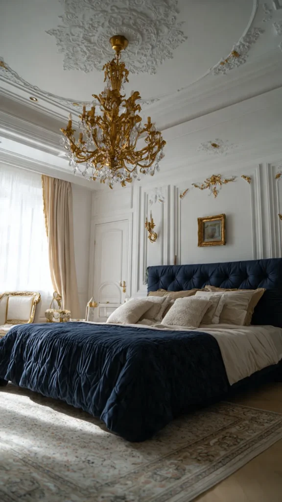A gold chandelier can transform a simple white bedroom into a show-stopping retreat. Against a white ceiling, gold lighting fixtures stand out as sculptural elements. Choose designs that suit your style, from modern geometric shapes to classic crystal chandeliers with gold frames. The white surroundings keep the chandelier from feeling overpowering, allowing it to shine as the room’s main focal point.