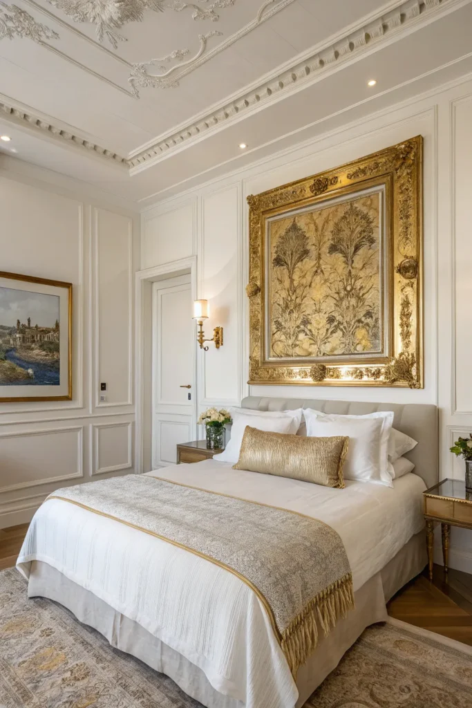 Artwork is an easy way to personalize a white and gold bedroom. Choose pieces that feature gold tones, metallic leaf details, or gold frames to complement the color scheme. Warm white walls provide the perfect backdrop for artwork to stand out without competing for attention. This idea works especially well in bedrooms where you want to introduce personality while maintaining a cohesive and elegant look.