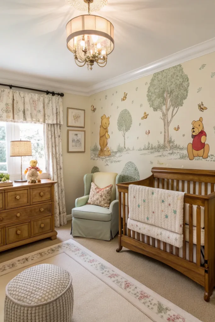 Honey pots and bees are iconic symbols of Winnie the Pooh and can be incorporated subtly into the nursery. Small honey pot illustrations, bee-shaped wall hooks, or soft yellow accents add charm without overpowering the room. Use these elements sparingly to maintain a balanced, timeless look that feels playful yet elegant.