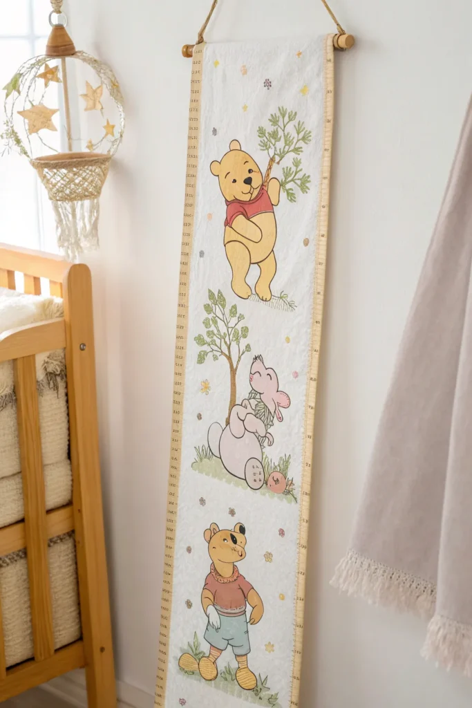 A Pooh-themed growth chart is both decorative and functional. Choose a wooden or fabric growth chart featuring Pooh and friends in soft colors. Hang it on an empty wall to track your child’s height as they grow. This charming detail adds a personal touch and becomes a keepsake you’ll treasure for years.