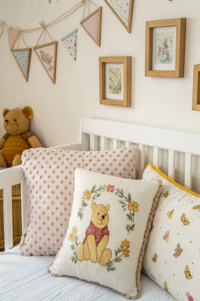Personalized name decor adds a special, one-of-a-kind element to the nursery. Wooden name signs, embroidered pillows, or framed prints featuring your baby’s name alongside Pooh illustrations make the space feel uniquely theirs. Keep the design simple and neutral so it blends seamlessly with the rest of the decor.