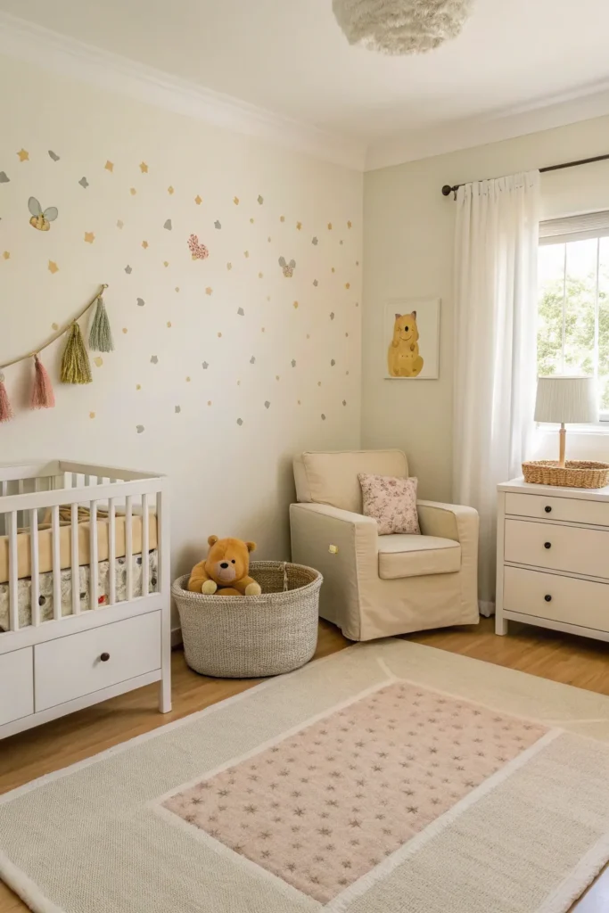 A timeless Winnie the Pooh nursery starts with a soft, neutral color palette. Think warm creams, gentle beiges, soft sage greens, and light honey tones. These colors reflect the peaceful forest setting of the Hundred Acre Wood and create a calming backdrop for your baby. Neutral walls also allow Pooh-themed accents to shine without overwhelming the space. This approach ensures the nursery grows beautifully with your child and doesn’t feel too themed as they get older.